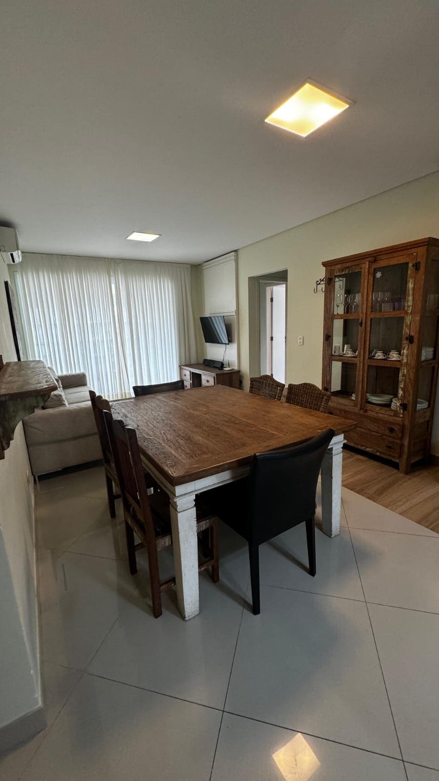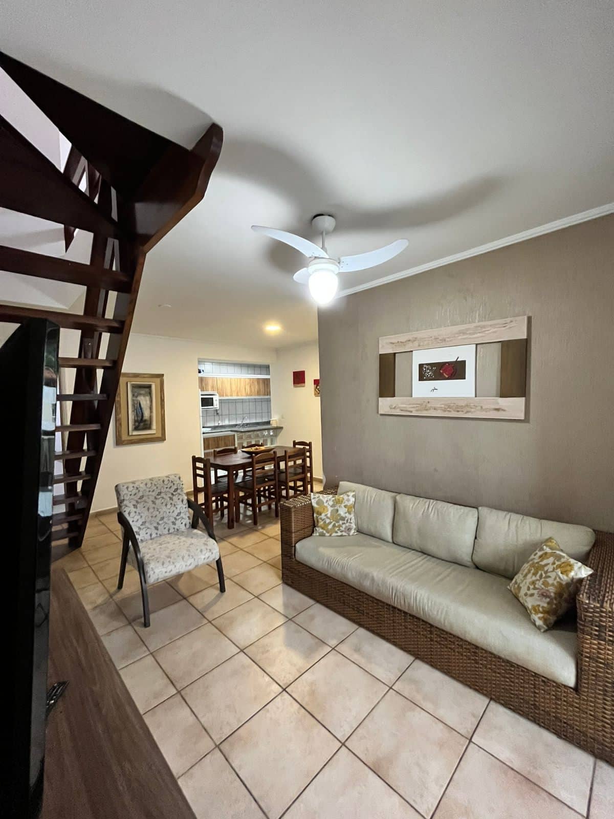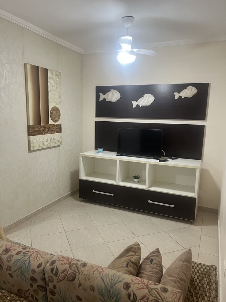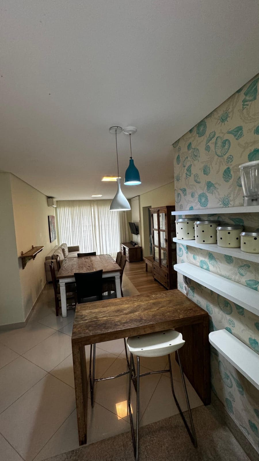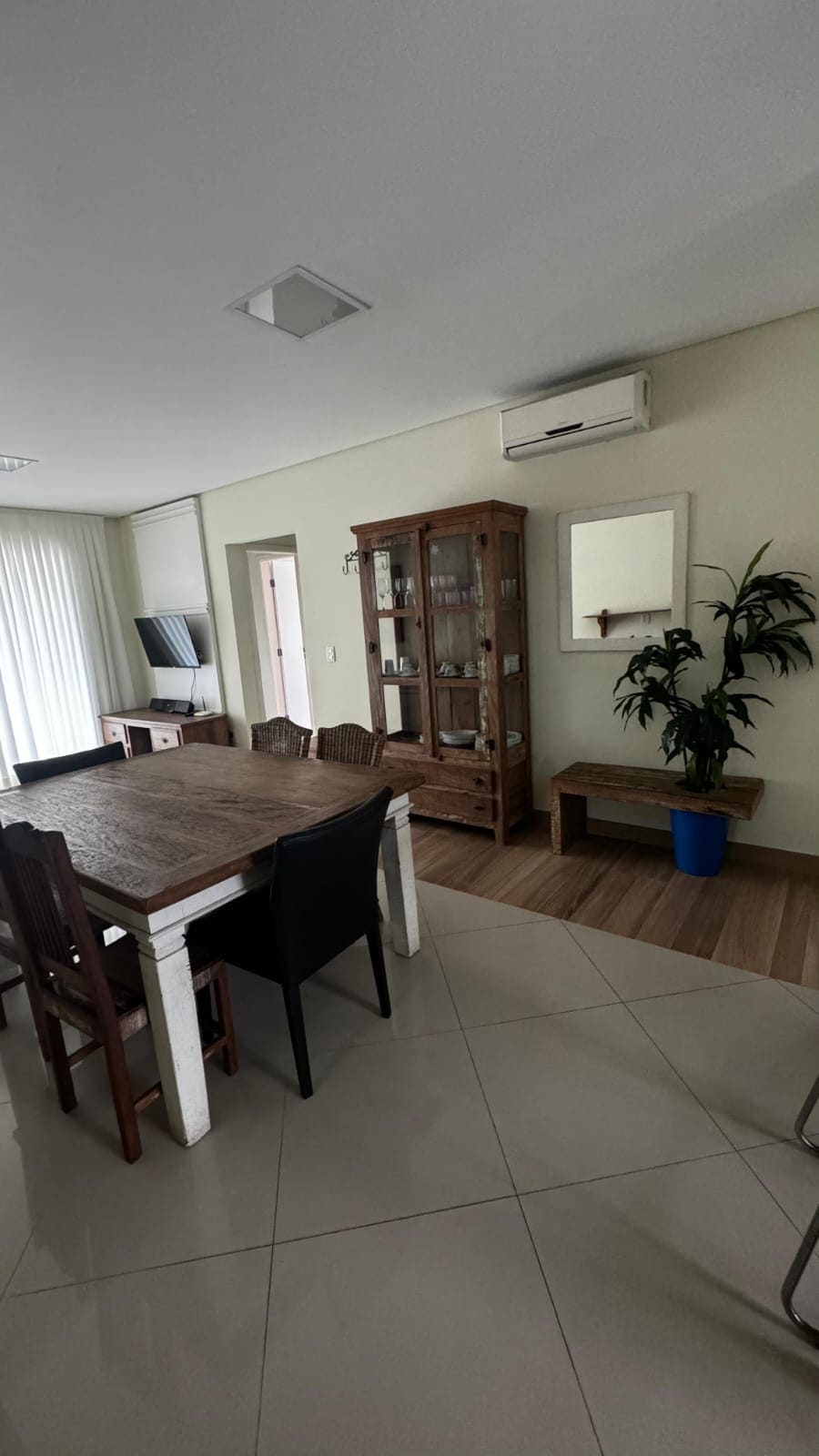 Descrição Completa: 2 dorm sendo 1 suite com ar condicionado e ventilador de teto, mais um banh social, sala de jantar, sala de tv , cozinha completa, varanda gourmet com churrasqueira, uma vaga de garagem coberta e possível conseguir mais uma vaga com o condomínio. Condomínio com piscina e mais churrasqueira na cobertura 150 mts da praia